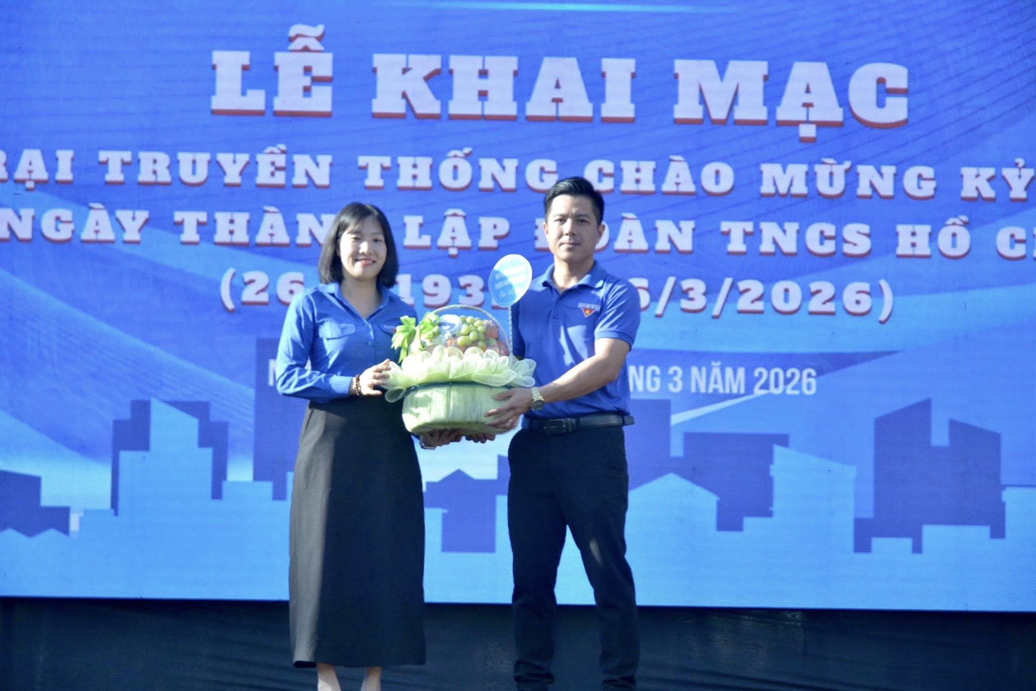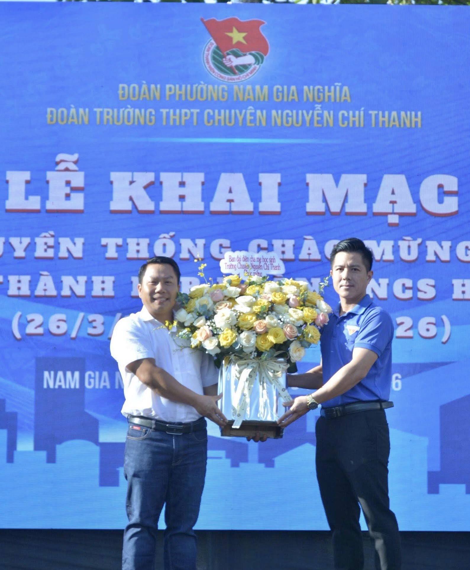 Đại diện Đoàn phường Nam Gia Nghĩa – Đồng chí Nguyễn Thị Hoài Thương – Phó Bí thư Đoàn phường (ảnh trên) và Ông Phạm Hải Long – Hội trưởng Hội CMHS nhà trường (ảnh dưới) tặng hoa và quà chúc mừng tuổi trẻ nhà trường nhân ngày kỷ niệm 95 năm thành lập Đoàn TNCS Hồ Chí Minh.