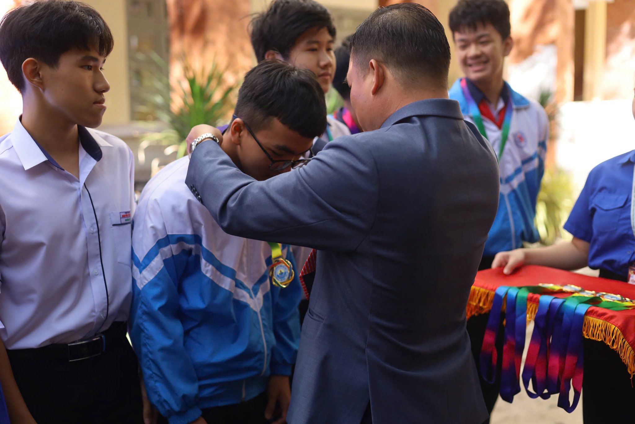 Bà Lê Thị Bích Liên – TUV, Giám đốc Sở Giáo dục và Đào tạo và Ông Tạ Ngọc Bảo – Bí thư Chi bộ, hiệu trưởng trường THPT chuyên Nguyễn Chí Thanh, trưởng Ban tổ chức trao giấy khen cho các em học sinh đạt Nhất môn